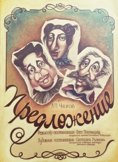 В центре сюжета — казалось бы простое и всем понятное событие: молодой человек собирается сделать предложение девушке. Кажется, что всё должно быть романтично и трогательно, как мы привыкли видеть это в жизни. Но Чехов показывает нам обратную сторону, возводя этот трепетный момент в настоящий фарс. Помещик Ломов решил жениться на дочери соседей Чубуковых. Нельзя сказать, что он испытывал большие чувства к ней, да и девушка не была слишком молода, просто «так надо» и время пришло. Практические интересы в этом деле играют большую роль. В общем, сплошной расчет и никакой любви. Продолжительность – 1 час (без антракта)
