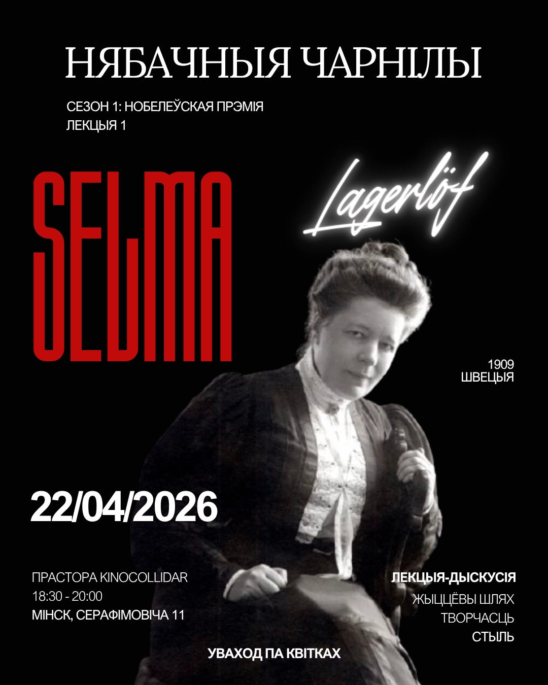 Сельма Лагерлёф — імя, якое павінна гучаць гучней. Яна была першай жанчынай у гісторыі Нобелеўскай прэміі па літаратуры (1909); настаўніцай, якая пайшла ў літаратуру ад роспачу; пісьменніцай, чыю біяграфію складана адрозніць ад міфа. Лекцыя праходзіць 1,5 гадзіны. Першая частка — жыццё. Як жанчына з маленькай шавецкай вёскі дайшла да таго, каб атрымаць прэмію ад караля? Што ёй каштавала гэтая дарога? Другая частка — тэкст. Разам паглядзім на тое, за што Нобелеўскі камітэт аддаў ёй прэмію. Першая лекцыя цыкла "Нобелеўская прэмія" праэкту Нябачныя Чарнілы.