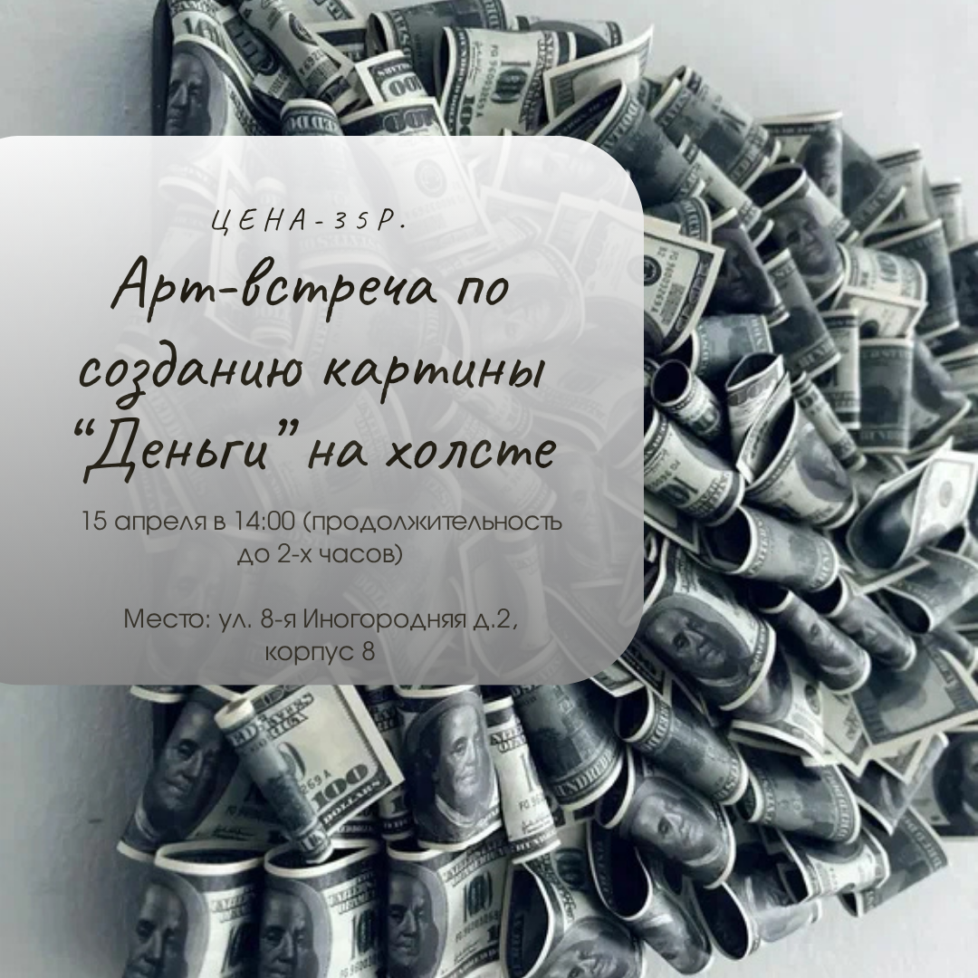 В спокойной и творческой атмосфере создадим картину на холсте «Деньги»💸 Пообщаемся и проведём с пользой свободное время. Чай, кофе, сладости и всё материалы включены в стоимость!