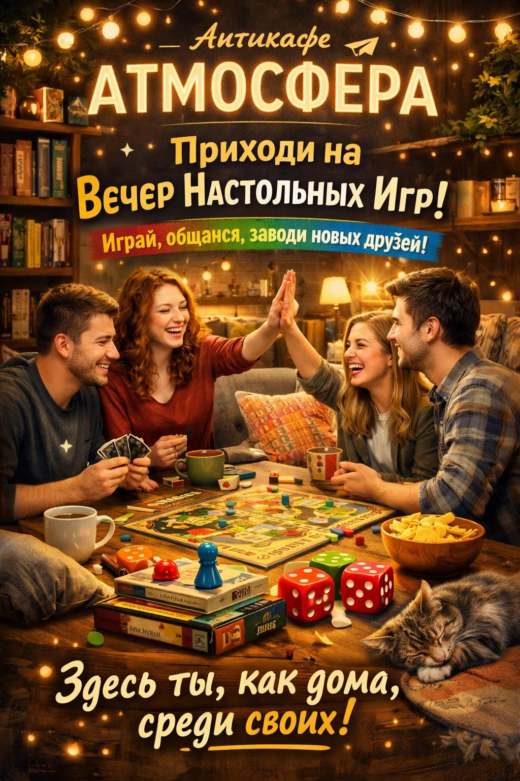 Всем привет! Играем в настолки в антикафе Атмосфера! Собираемся каждую пятницу в 19:00 и каждое воскресенье в 19:30. Есть и другие мероприятия каждый день. Все максимально просто, дружно и весело. Смело приходи один или с друзьями! Большая игротека, дружная компания, вкусный чат или что покрепче ) Ждём тебя! Оплата только за время в антикафе- 25р/целый день. Записаться можно здесь или по телефону +375297766557