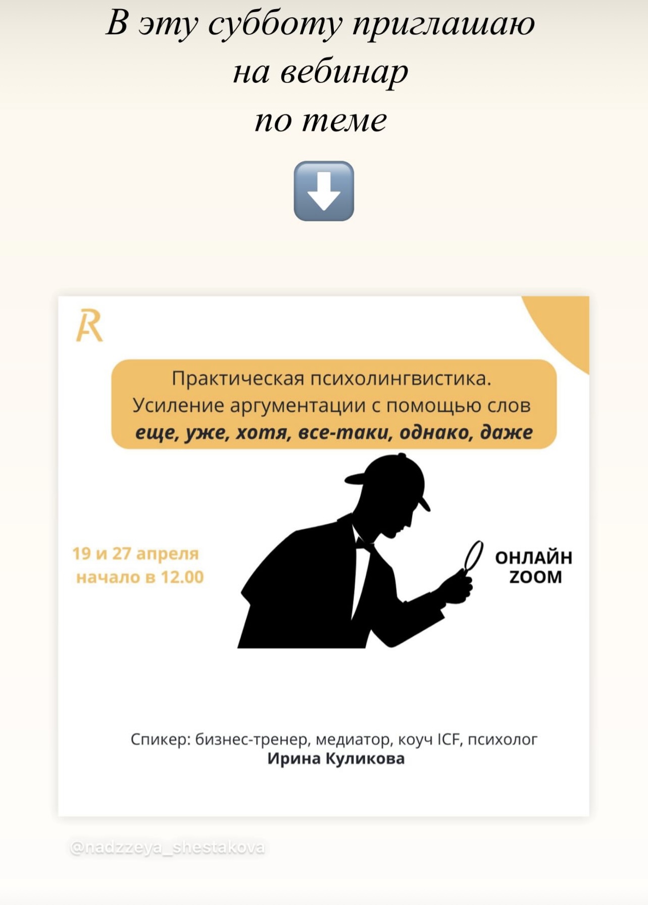 «Практическая психолингвистика – усиление аргументации с помощью слов еще, уже, хотя, все-таки, однако, даже». На занятии вы узнаете особенности формирования слов усилителей аргументации и различных тактик убеждения с помощью этих слов. ✅ Что вас ждет 19 апреля? - Краткий обзор аргументативного потенциала слов уже и еще, хотя. -Составление фраз по образцу: тактика убеждения, тактика запроса информации, тактика упрека, тактика одобрения, тактика предположения, тактика признания. -Разбор устойчивых выражений успешных спикеров (из личного наблюдения). Например: как говорится…,гораздо важнее…,я напомню…,в известной степени…,это безусловно… и др