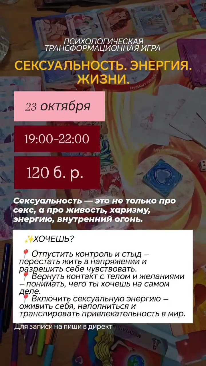 Женская трансформационная игра, которая снимает блоки, раскрывает сексуальность и даёт конкретный план действий. Раскрой себя за 2,5 часа и почувствуй радость жизни. Ты устала чувствовать стыд, контроль или пустоту в отношениях и в себе? Всего за одну игры ты получишь конкретные шаги, чтобы: • Понять, что реально мешает раскрыть сексуальность и удовольствие • Снять внутренние блоки, страхи и стыд • Включить живость, радость и энергию в повседневную жизнь • Испытать лёгкость и ресурс, который остаётся с тобой надолго • Проявляться там, где комфортно, и получать советы только с твоего разрешения Игра сочетает индивидуальный подход и групповую динамику каждый идёт своим путём, но при этом получает мощно!