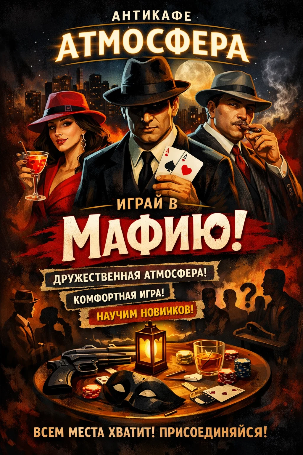 Привет. Собираем компанию поиграть в Мафию в уютной и дружелюбной компании. Минимум тактичности. Новички приветствуются, несмотря на большое количество опытных игроков. Стоимость 30р, включает время в антикафе, неограниченный чай и печеньем. Можно прийти раньше, поиграть в приставку или поработать. Играем в полуспортивную мафию с провессиональной ведущей. Смело приходи один! Будет здорово) Записаться можно сдесь или по тел 80297766557
